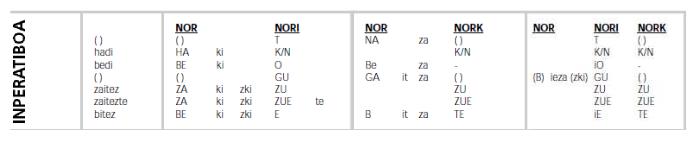 En cuanto al NOR-NORK, vemos que las terceras personas, comienzan por la letra b, pero en Hegoalde, no se utiliza esta letra, por tanto, diremos ezazu, ezazue, itzazu e itzazue en lugar de bezazu, etc…