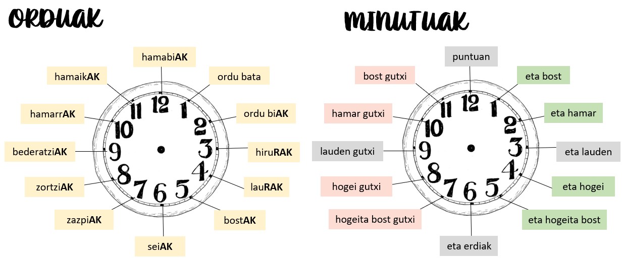 Zer ordutan? Zer ordutatik? Las horas, por supuesto, se pueden declinar. A continuación, tienes disponibles varias tablas de consulta:
