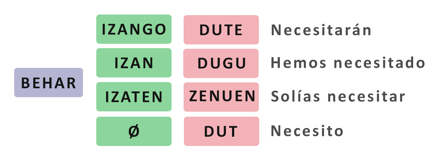 No tiene mucho misterio, se construyen prácticamente igual que los transitivos, el nombre del verbo permanece inalterable (BEHAR), y para marcar el aspecto del verbo, es decir, si es pasado, presente o futuro, se declina el IZAN (IZANGO, IZATEN...). Por último, incluimos el auxiliar que corresponda. En este caso, como son transitivos nuen, genuen, zuten, etc.